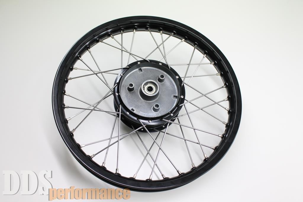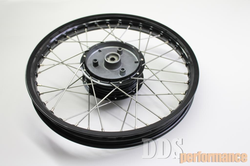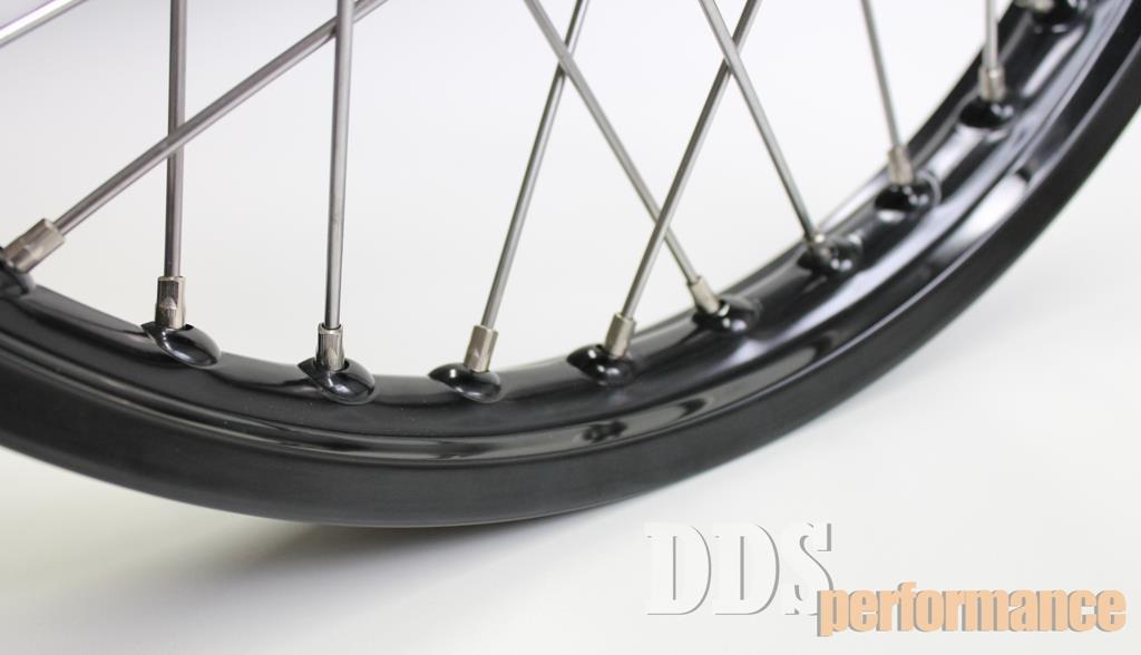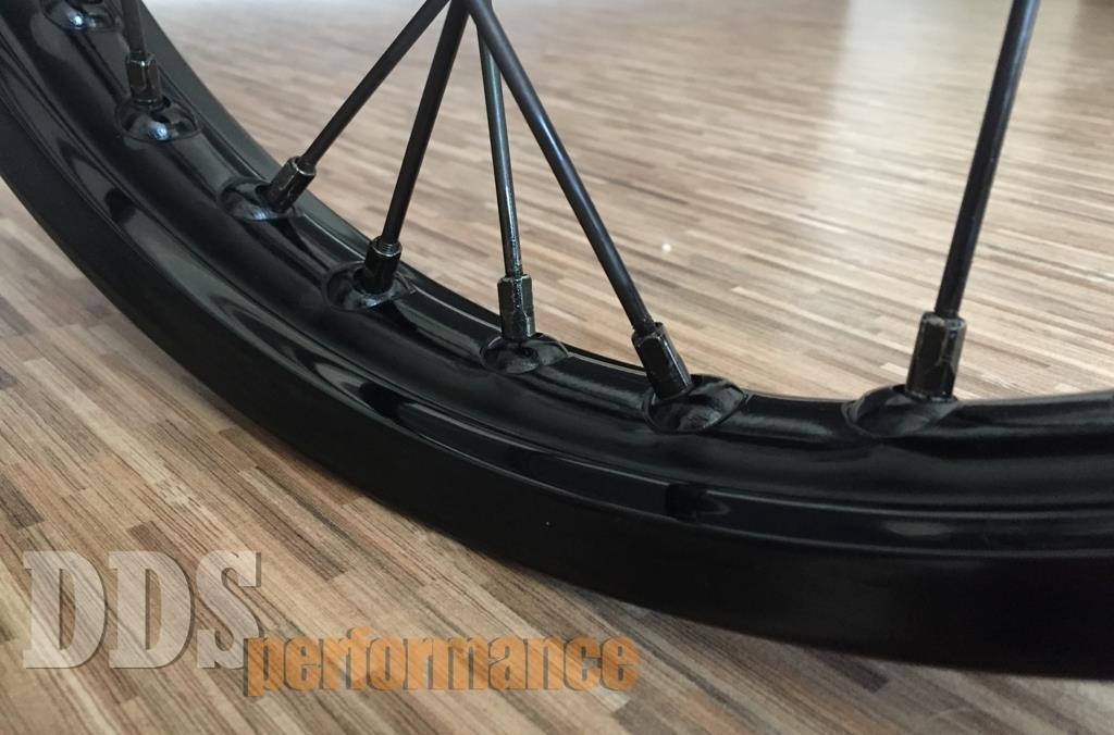 Das Speichenrad wird mit einer schwarzen Alufelge in dem Maß 1,5×16 gespeicht und zentriert.